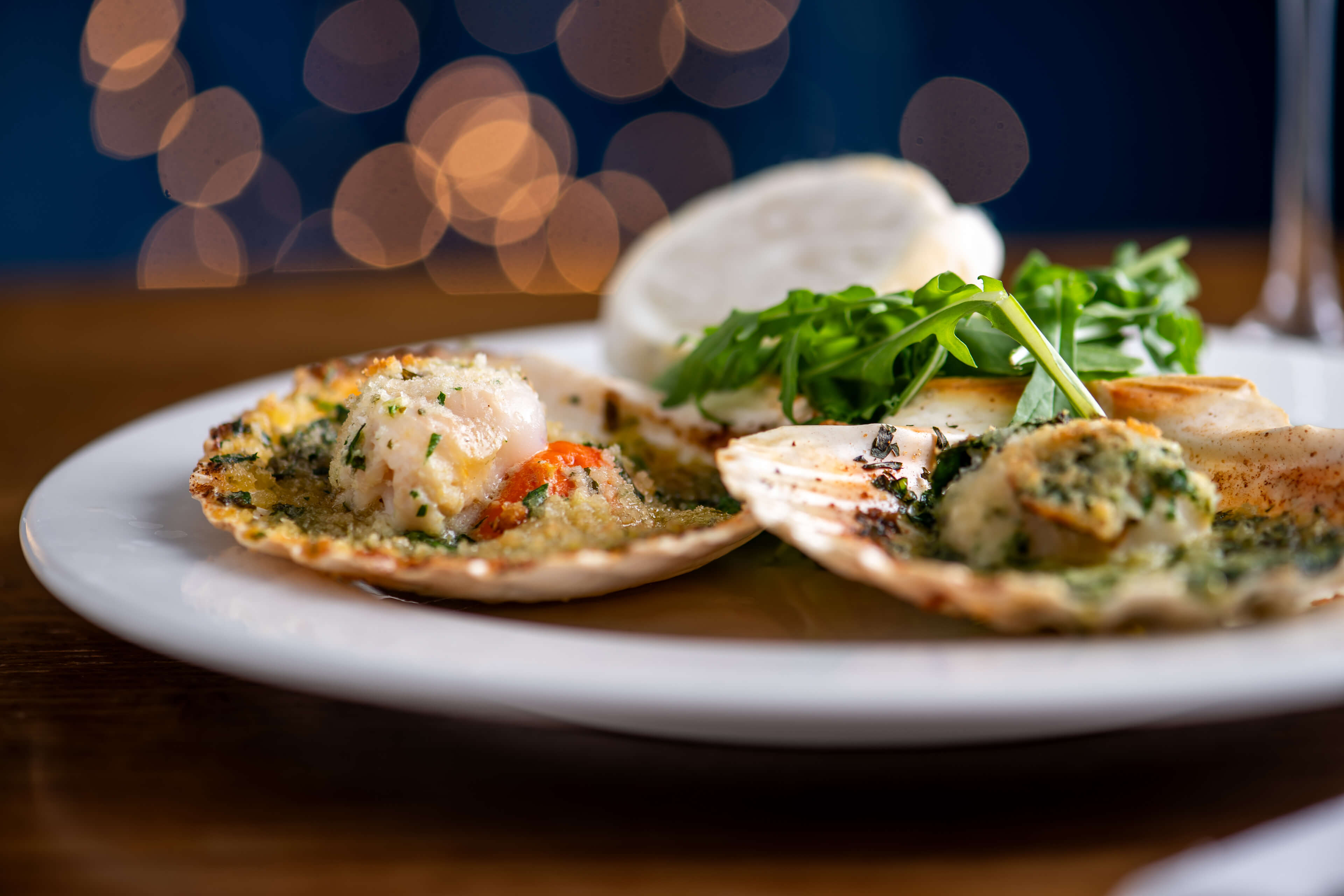 Sautéed scallops cooked with white wine and garlic butter, topped with breadcrumbs and Pernod, fillets of sea bass, sea bream and chilli, ginger and garlic prawns.